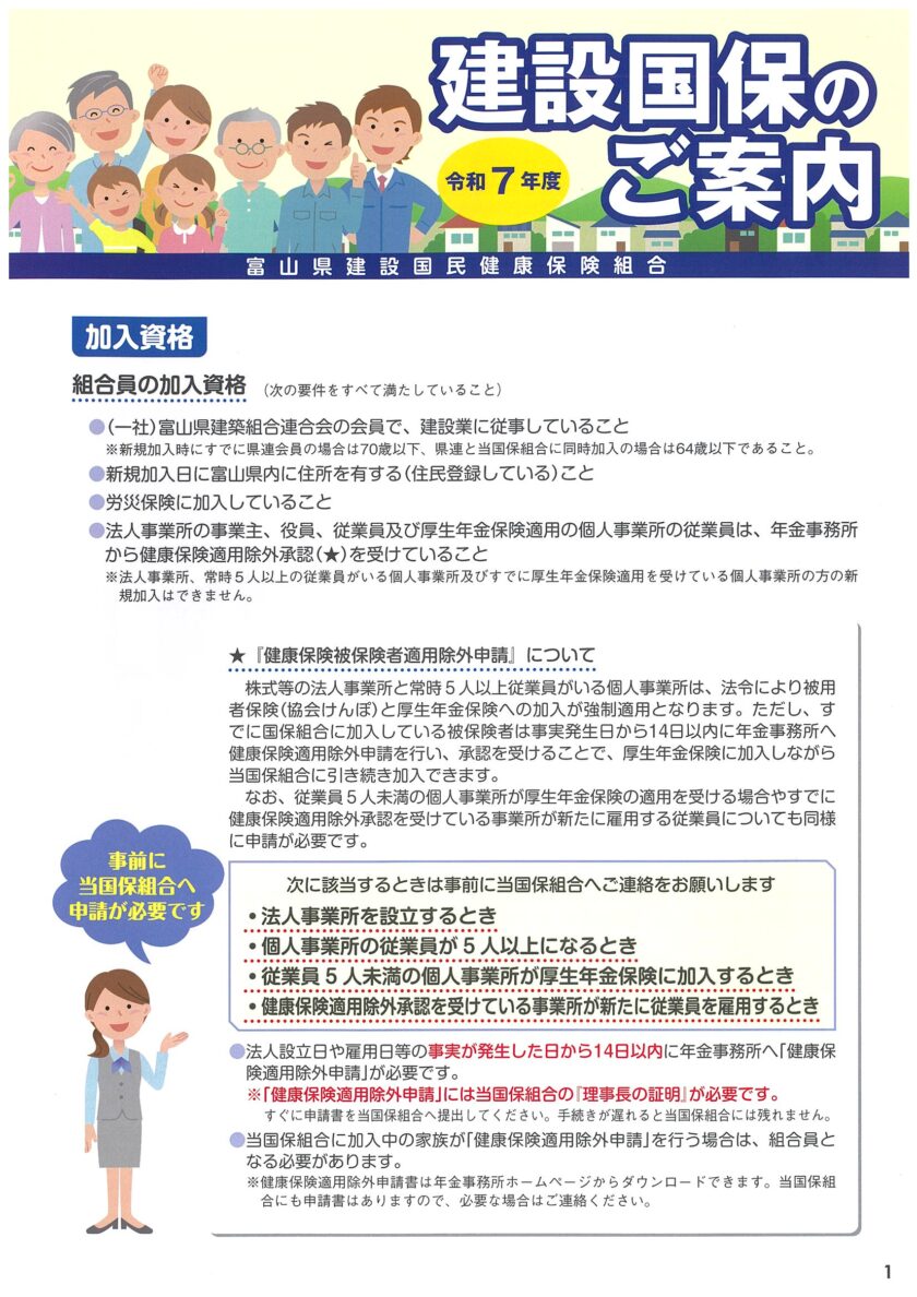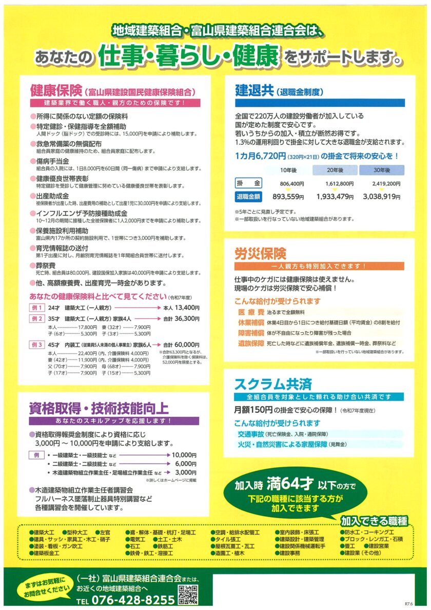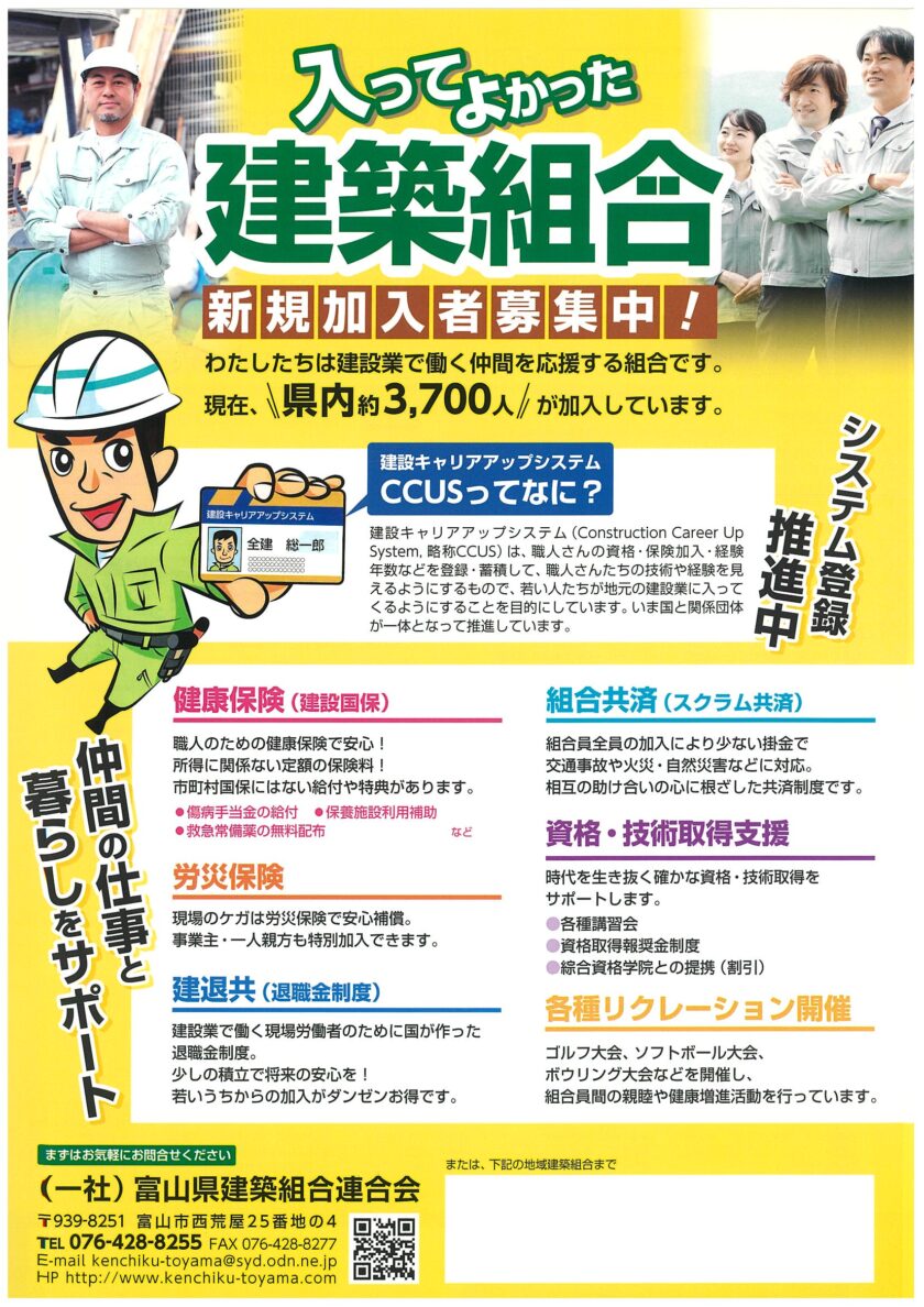 このような状況のもと、建設業従事者が多く集まる事業所等に「富山県建築組合連合会」と当連合会の会員とその扶養家族を被保険者とする「富山県建設国民健康保険組合(建設国保)」の存在を改めて周知し、併せてその特徴・優位性をアピールするためのチラシを配置したいと考えております。