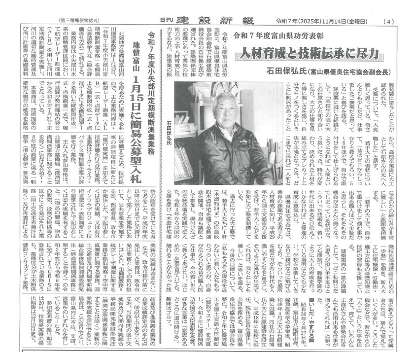 当協会筆頭副会長(前代表理事) 石田保弘 氏が、令和7年度富山県功労表彰を受彰しました。