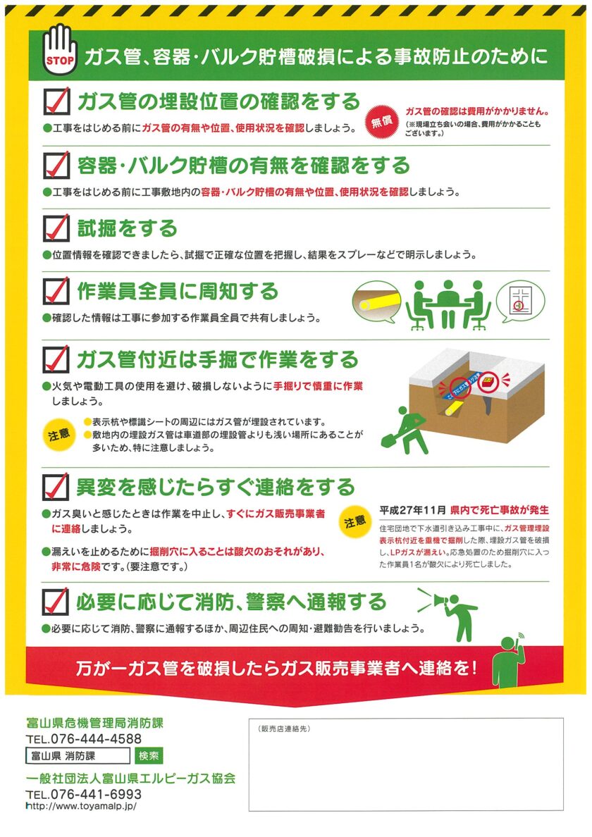 令和6年12月、令和7年9月・12月とガス配管を損傷し、ガス漏れが発生する事故が起き、今回さらなる周知のため事故防止チラシを配布いたします。