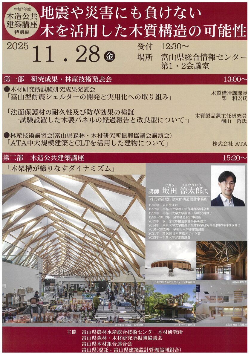 木造公共建築講座特別編「地震や災害にも負けない 木を活用した木質構造の可能性」チラシ