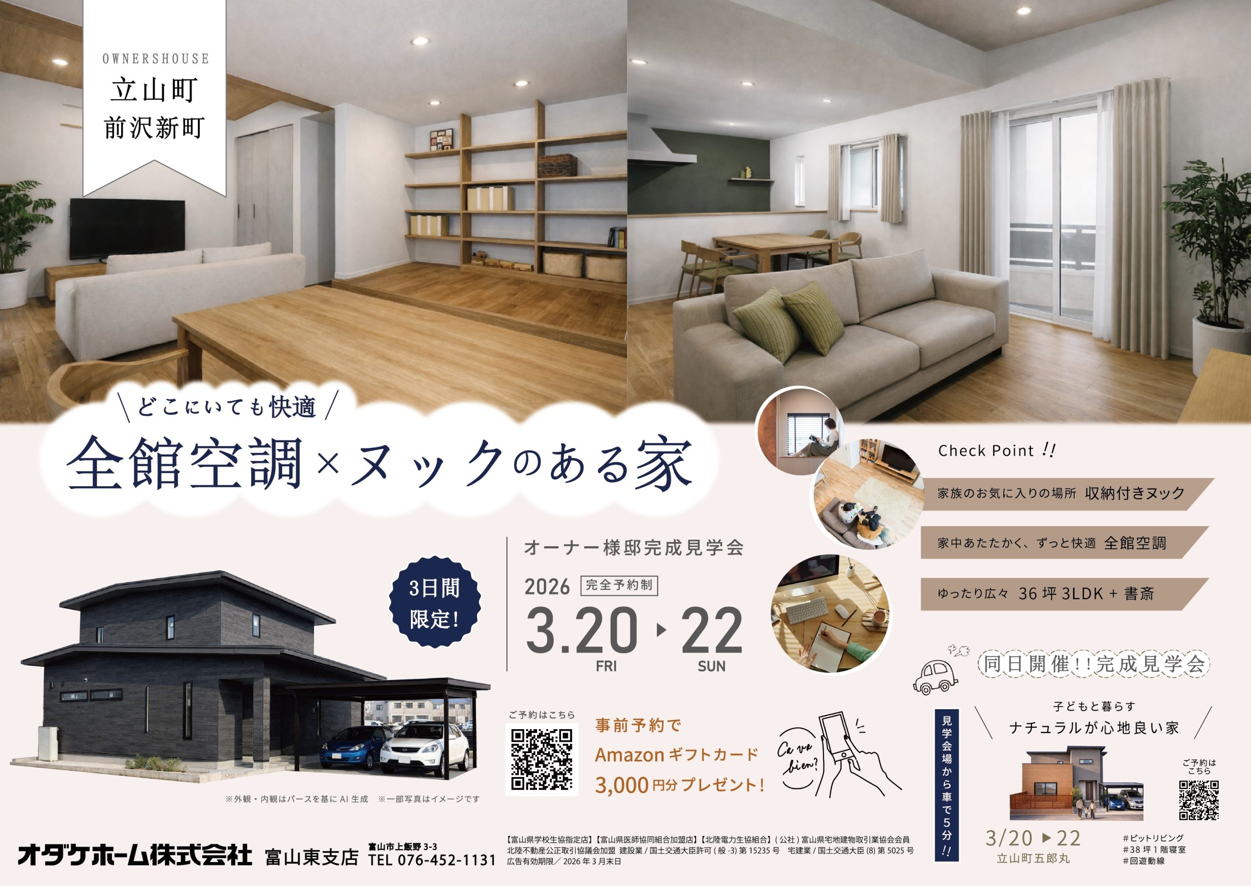 立山町前沢新町にてお客様邸の完成見学会を開催! 3日間限定開催となりますため、お早めにご予約下さい♪ <受付時間>10:00~17:00 ご予約は下記ページ予約フォームより↓ ●●●詳細および来場申込はオダケホームHPで●●●