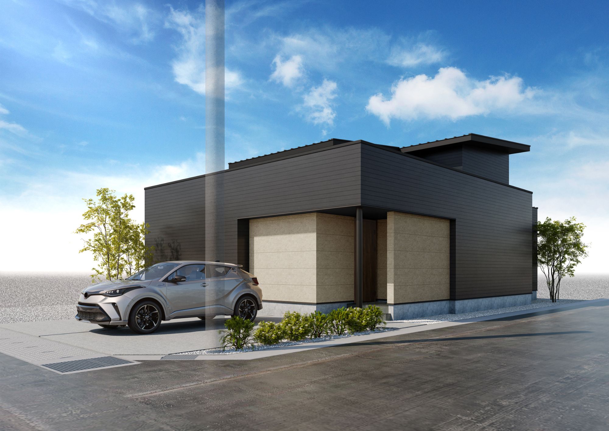 街並みに自然と馴染みながらも、「平屋っぽくない」と感じてもらえるモダンな外観です。