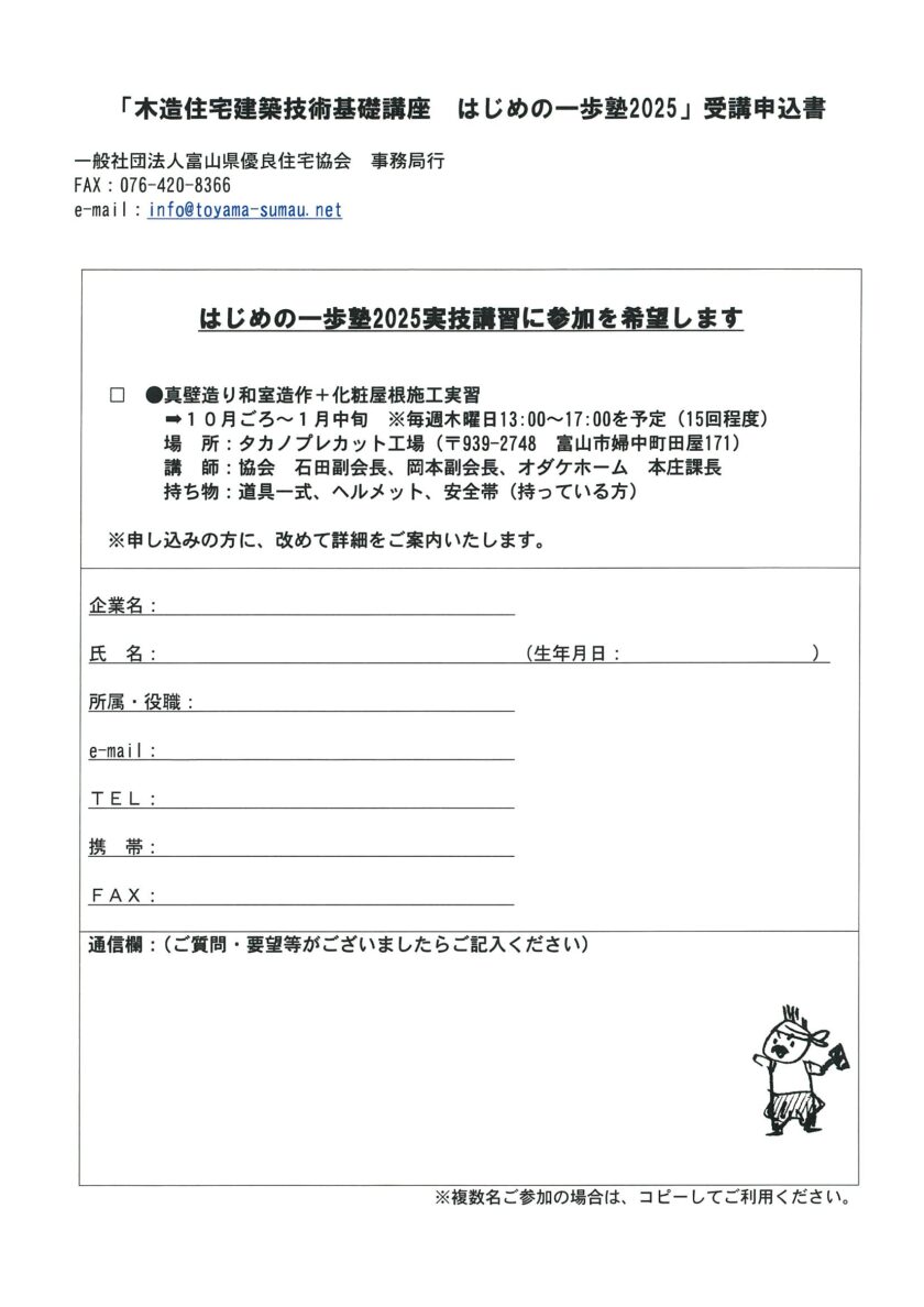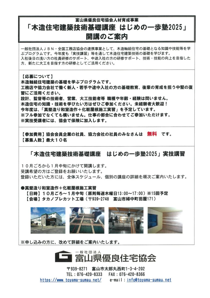 ※詳細・受講申込書:「とやま木造住宅建築技術基礎講座 はじめの一歩塾2025」受講申込書(2025.08.28)